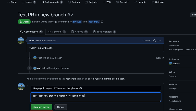 기존에 아래와 같이 feature/1이라는 브랜치가 있고 해당 브랜치에서 PR이 날려진 상황입니다. 이때, merge 버튼을 눌러 merge를 완료하면 feature/1 브랜치가 삭제됨을 확인할 수 있습니다.