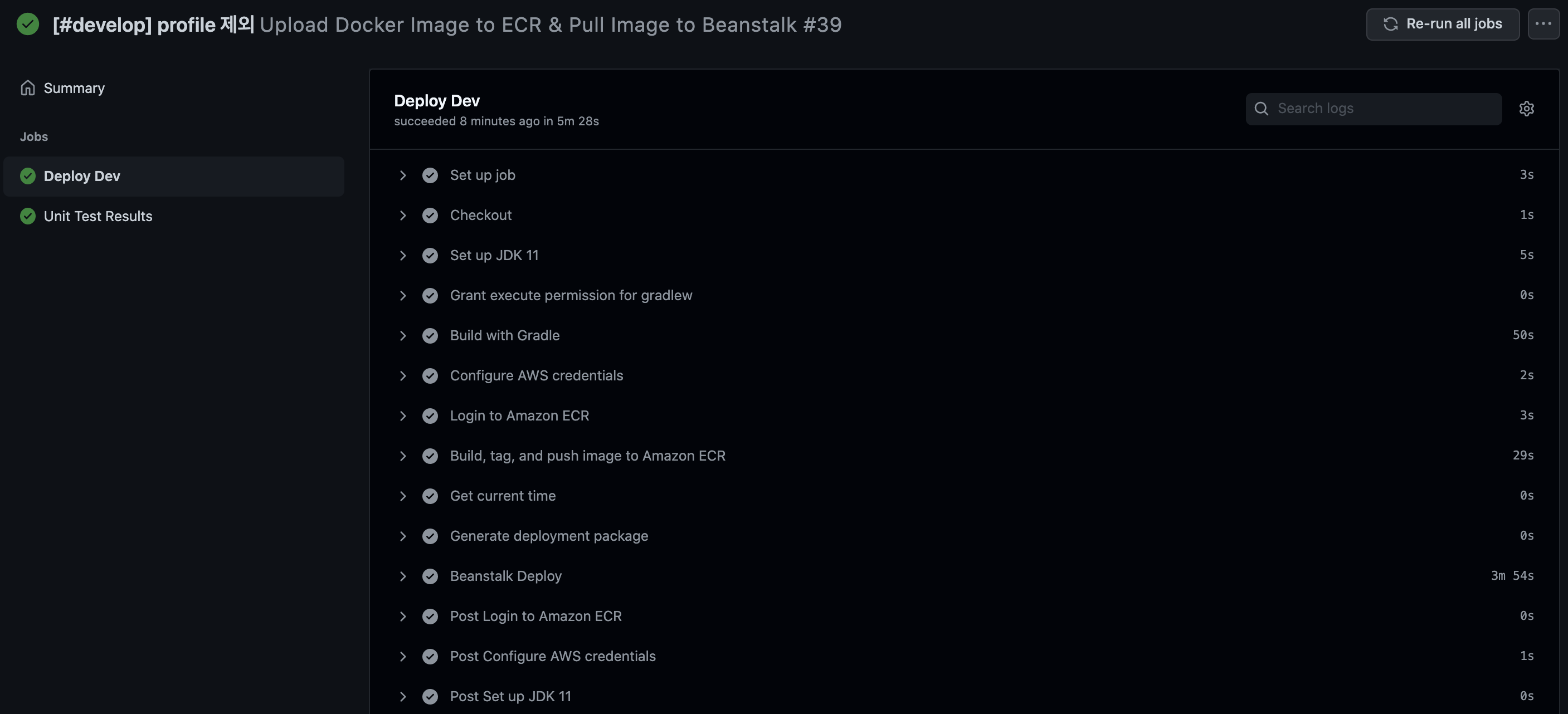 위와 동일하게 세팅하였다면, develop에 push를 하면 해당 Github Action이 수행되고, 수행이 완료되면 하기와 같이 Elastic Beanstalk의 환경의 실행 버전이 변경됩니다.