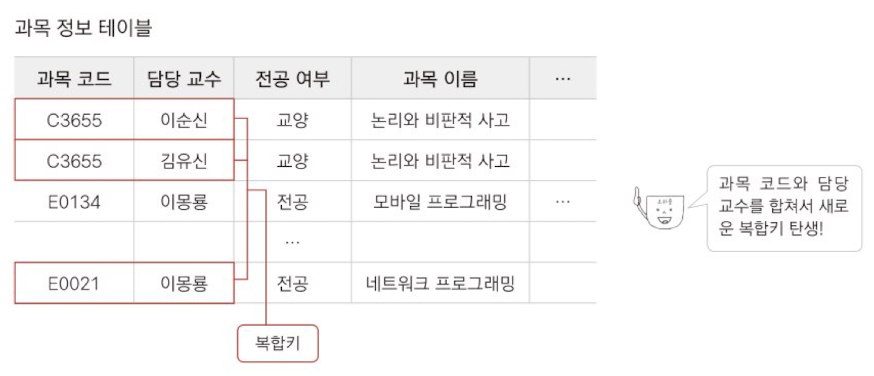 위 예시와 같이 하나의 과목을 여러 교수님이 담당하고 있다면, 과목 코드와 담당 교수 컬럼을 묶어 복합키를 기본키로 사용하여 레코드를 식별할 수 있습니다.