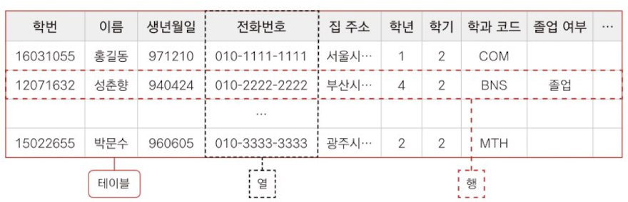 - 가로줄은 행(row)이라고 하며 하나의 개체를 구성하는 여러 값을 의미합니다.