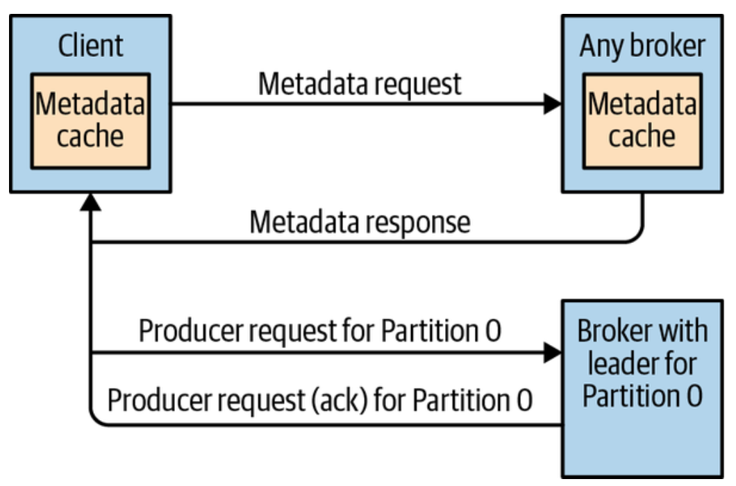 카프카 클라이언트는 메타데이터 요청이라 불리는 또 다른 유형의 요청을 사용한다. 모든 브로커는 이 정보를 포함한 메타데이터 캐시를 가지고 있기 때문에 아무 브로커에나 메타데이터 요청을 해도 된다. 클라이언트는 메타데이터 요청을 통해 메타데이터 정보를 캐싱해두었다가, 이 정보를 이용해 각 파티션 리더 역할을 맡는 브로커에 쓰기/읽기 요청을 보낸다.