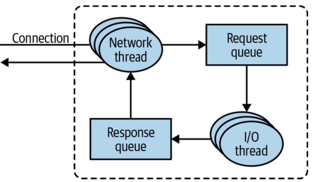 위 과정을 통해 요청이 요청 큐에 들어오면 I/O 스레드(request handler 쓰레드라고도 불림)가 요청을 처리하느 ㄴ일을 담당한다.