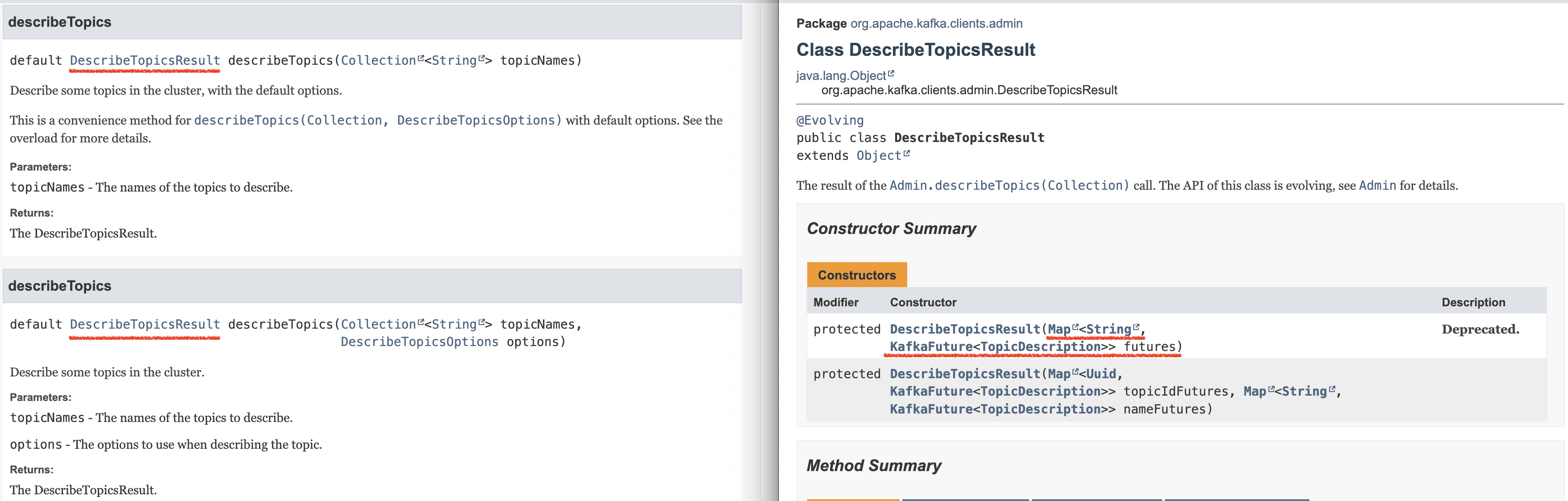 ❷ DescribeTopicResult에 대해 values() 메소드를 호출하면, DescribeTopicResult 갖고 있는 key는 토픽명, value는 토픽에 대한 상세 정보를 가진 Future 객체로 하는 Map을 반환하고, 이때 get(TOPIC_NAME)을 하면 Map에서 해당하는 토픽의 Future 객체를 조회하게 된다. 이후 get()을 한 번 더 호출함으로써 Future 객체의 응답을 받아올 때까지 블로킹된다.