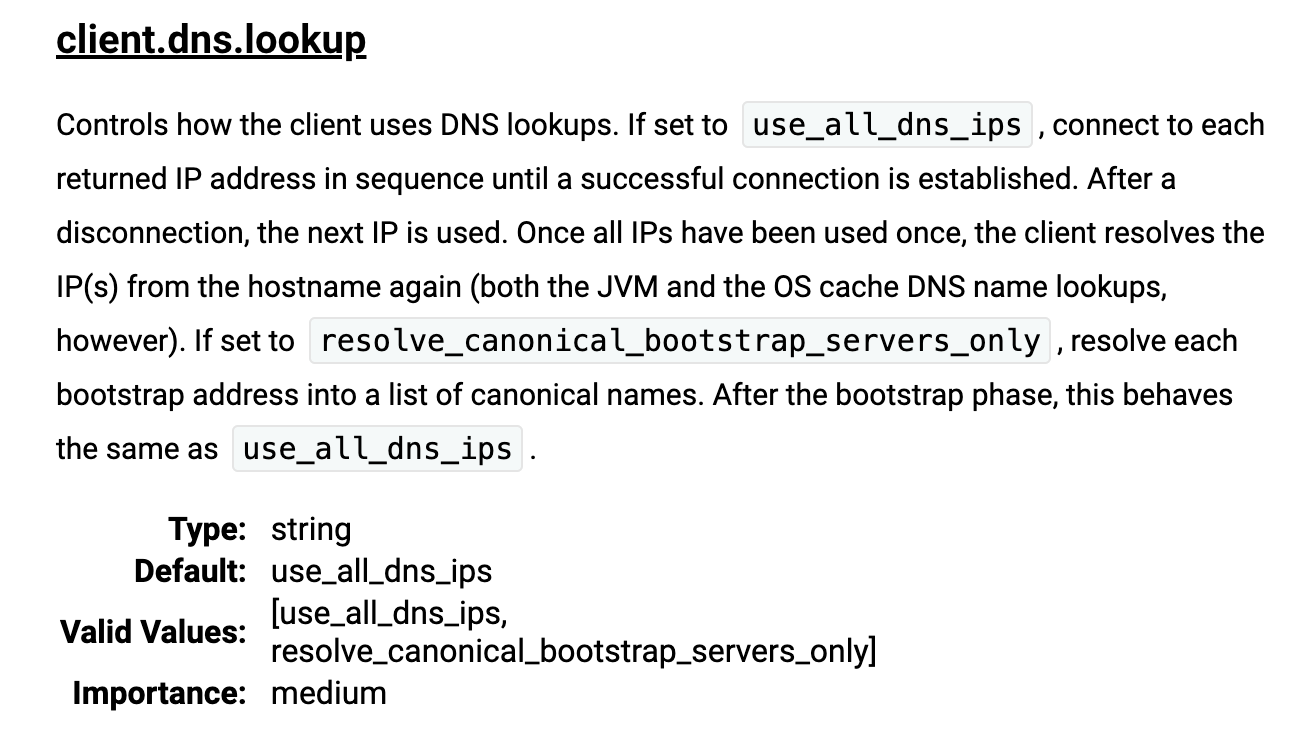 이로 인해 클라이언트가 로드 밸런싱 계층의 고가용성을 활용할 수 있도록 client.dns.lookup=use_all_dns_ips를 활용할 수 있다.