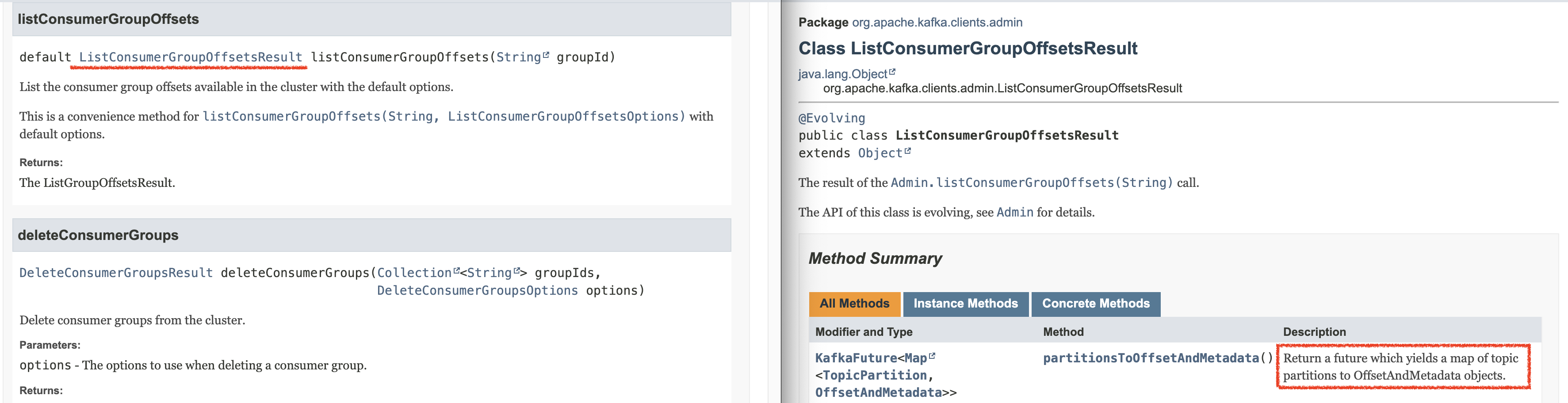 ❶ 컨슈머 그룹이 사용중인 모든 토픽 파티션을 key로 가지고 있고, 각 토픽 파티션에 대해 마지막으로 커밋된 오프셋을 value로 가진 맵을 가져온다. listConsumerGroupOffsets()은 describeConsumerGroups()와 다르게 하나의 컨슈머 그룹만 인자로 넘길 수 있다.