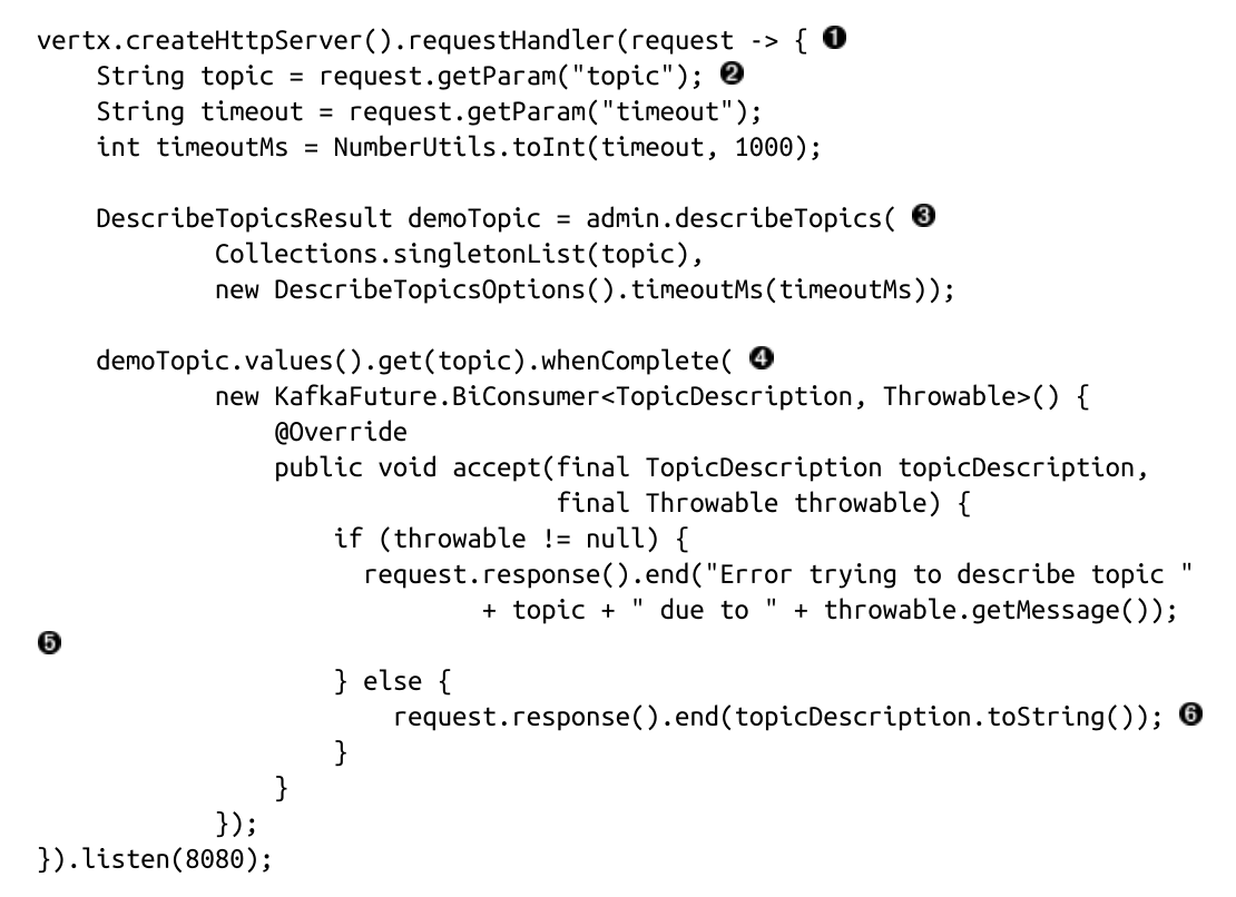 앞선 예시는 Future 객체에 블로킹 방식으로 작동하는 get()을 호출한다. 일반적으로 어드민 작업은 드물고, 작업이 성공하거나 타임아웃날 때까지 기다리는 것이 보통 부담되지 않기 때문이다. 하지만, 많은 어드민 요청을 처리할 것으로 예상된다면, 카프카 응답이 올 때까지 서버 스레드가 블록되는 것은 방지하고 싶을 수 있다. 이때를 위해 KafkaFuture는 작업 완료 시 수행되는 콜백함수를 지정할 수 있다.