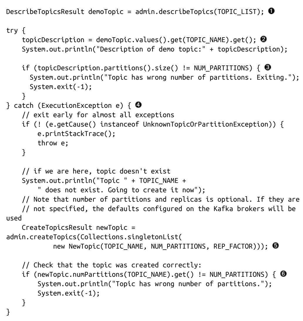 ❹ AdminClient의 result 객체는 카프카가 에러 응답을 보낼 경우 ExecutionException을 발생시킨다. 자세한 에러 원인을 보기 위해서는 ExecutionException의 cause를 확인해야 한다.