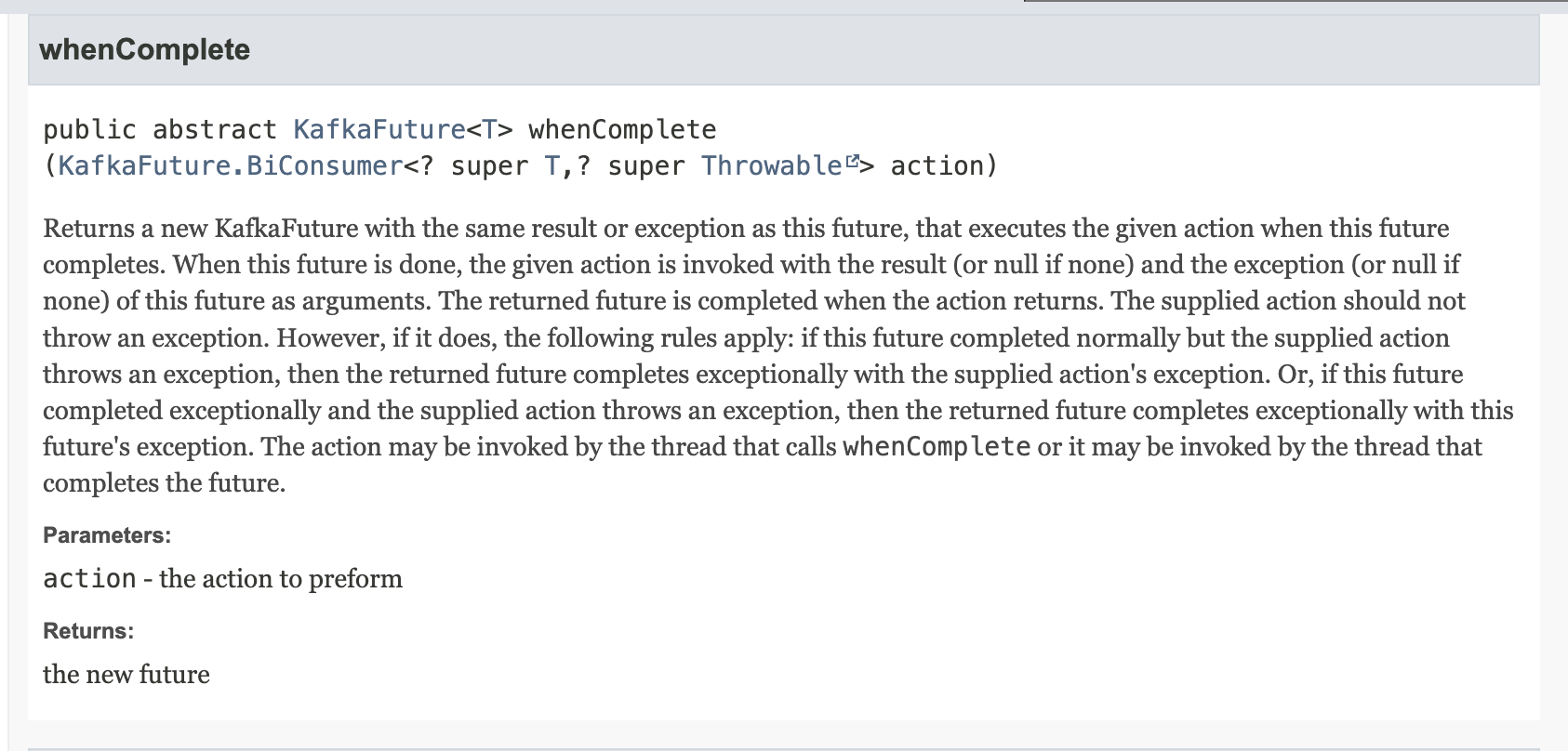 ❹ DescribeTopicsResult에 .values().get(topic) 함수를 호출하면 해당 토픽에 대한 정보를 가진 KafkaFuture<TopicDescription>을 반환한다. KafkaFuture 클래스 내에는 whenComplete() 함수를 제공하는데, 이 함수는 future가 완료되면 파라미터로 전달한 함수를 유발한다.