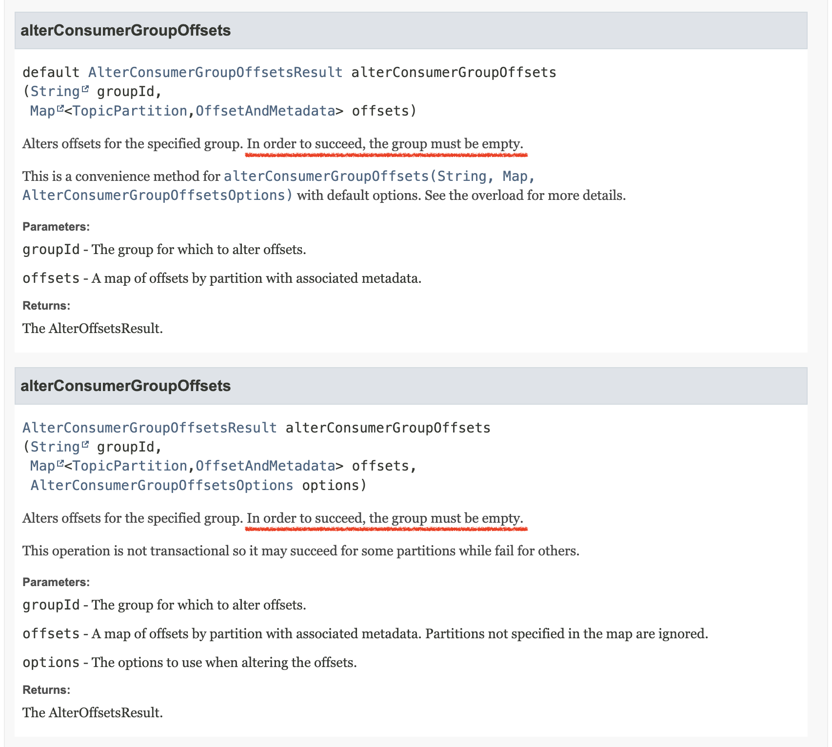 오프셋 토픽의 오프셋 값을 변경하여도 컨슈머 그룹에 변경 여부가 전달되지 않으며, 컨슈머 그룹은 컨슈머가 새로운 파티션을 할당받거나 새로 시작할 때만 오프셋 토픽에 저장된 값을 읽어온다. 따라서, 컨슈머가 모르는 오프셋 변경을 방지하기 위해 카프카에서는 현재 작업이 수행되고 있는 컨슈머 그룹에 대해서는 오프셋 수정을 허용하지 않는다.