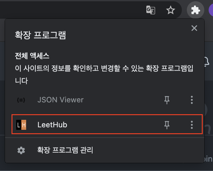LeetHub 확장자를 추가하면 아래와 같이 확장 프로그램 목록을 클릭했을 때, LeetHub가 보이게 됩니다.