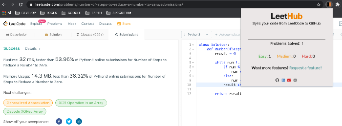LeetCode에서 문제를 하나 예시로 풀어보았을 때, 아래와 같이 문제가 카운팅되었고 문제를 풀자마자 바로 Github에 올라가는 것을 확인할 수 있었습니다.