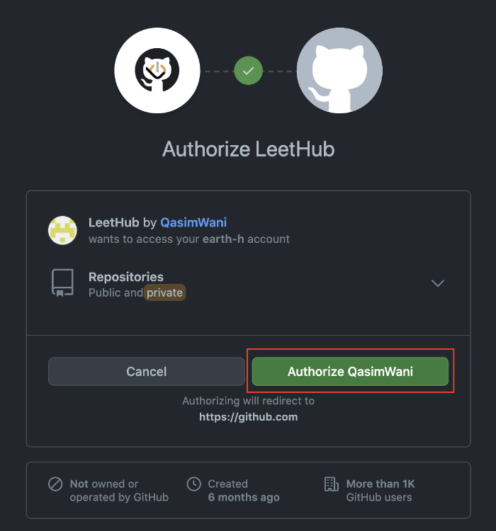 이렇게 추가된 LeetHub 확장자를 누르면 아래와 같이 GitHub Authenticate 화면이 나오고 Authorize QasimWani를 누르면 인증이 완료됩니다.